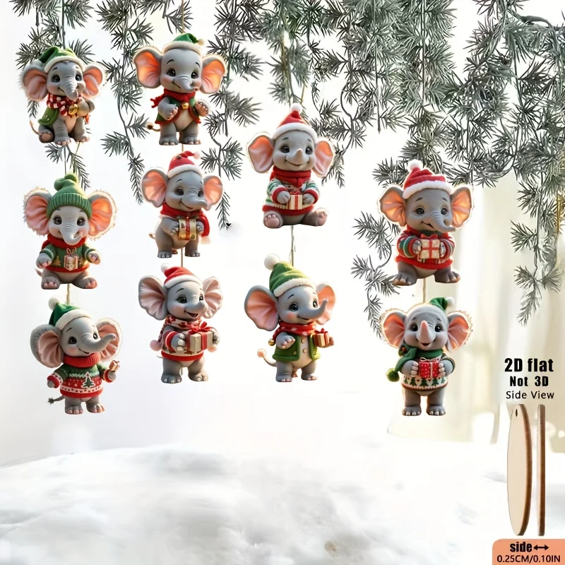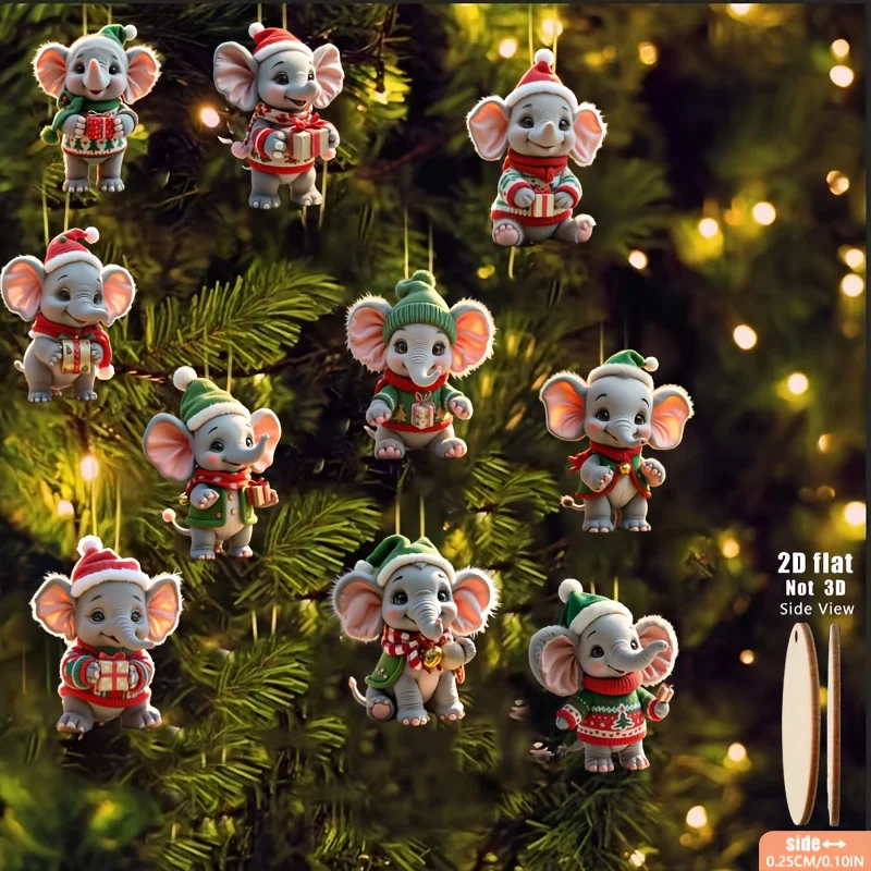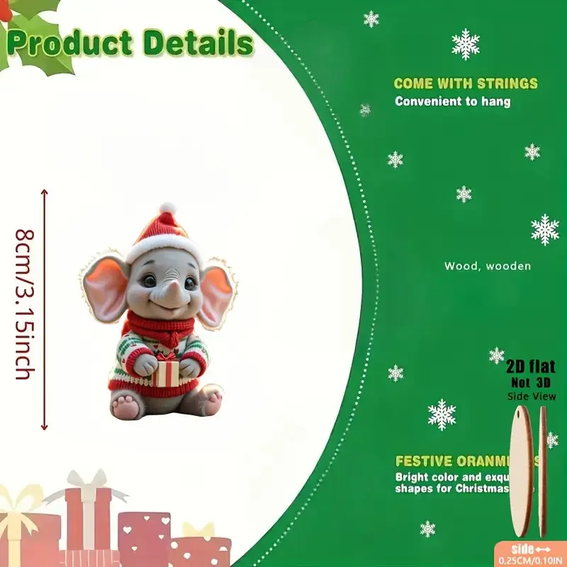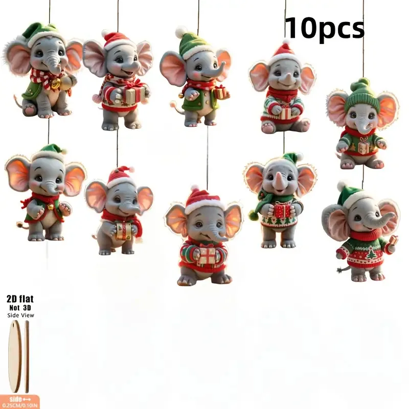 10pcs Cute Christmas Elephant 2D Wooden Pendant Elephant Wearing Clothes Hat for Christmas New Year Valentine's Day Decorations