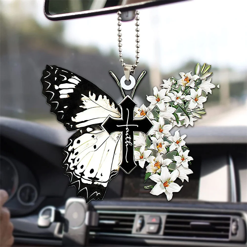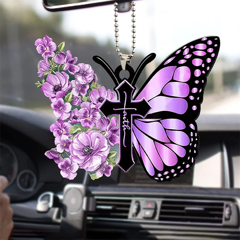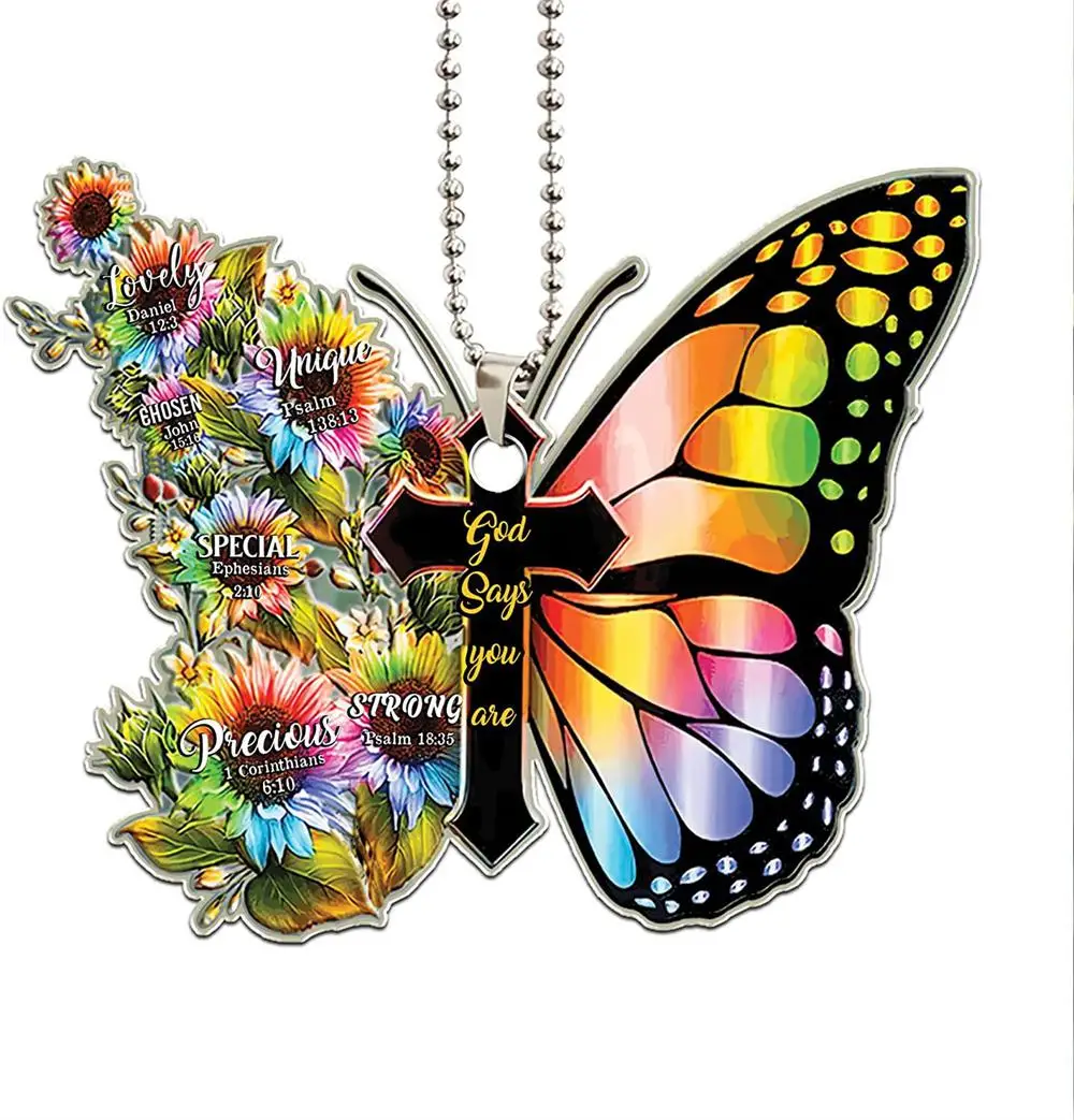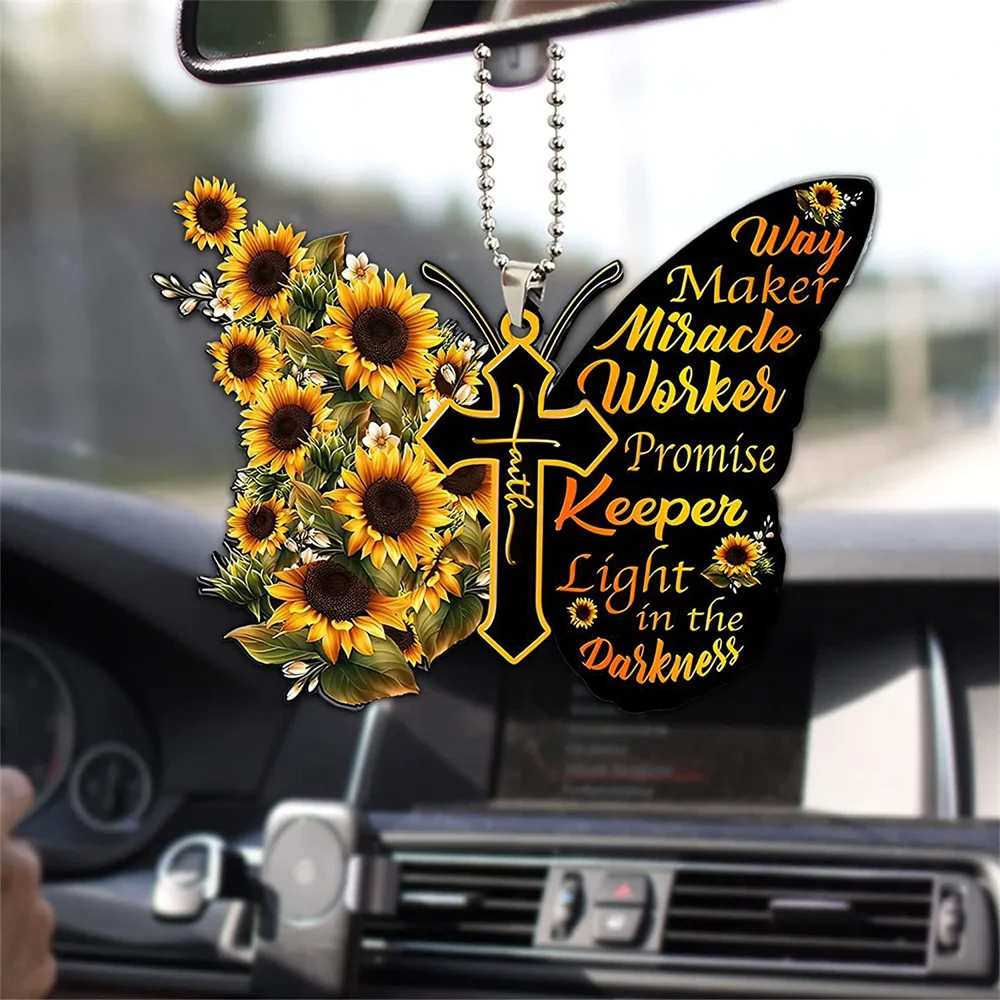 Butterfly Cross Hanging Decoration For Car Sunflower Butterfly Car Charm Rear View Mirror Accessories Car Interior Decor Pendant
