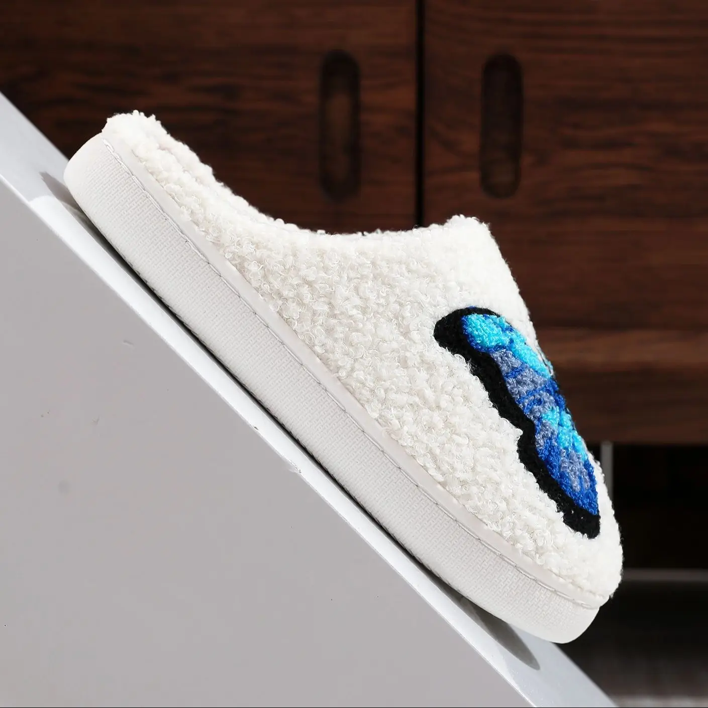 Butterfly Pattern Embroidery Plush Home Thick-Soled Comfortable Woolen Cotton Slippers Warm Non-Slip Indoor Slippers