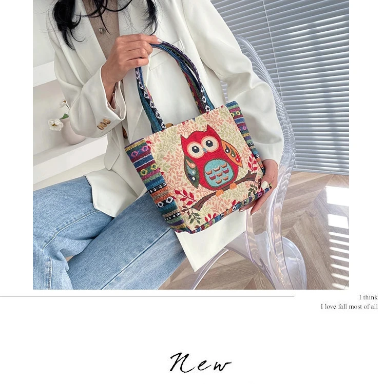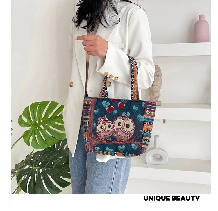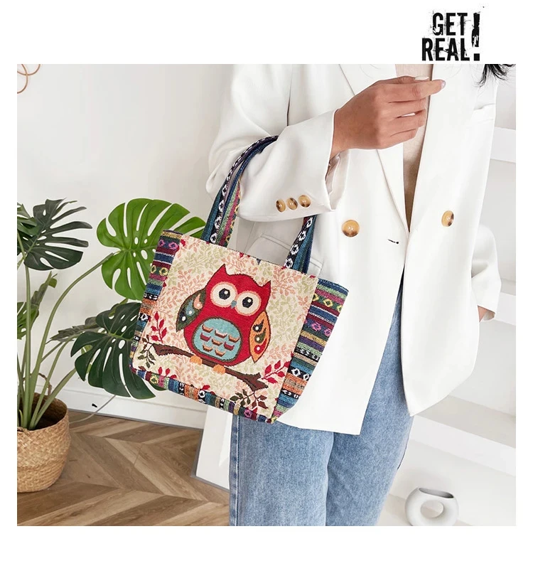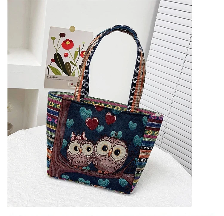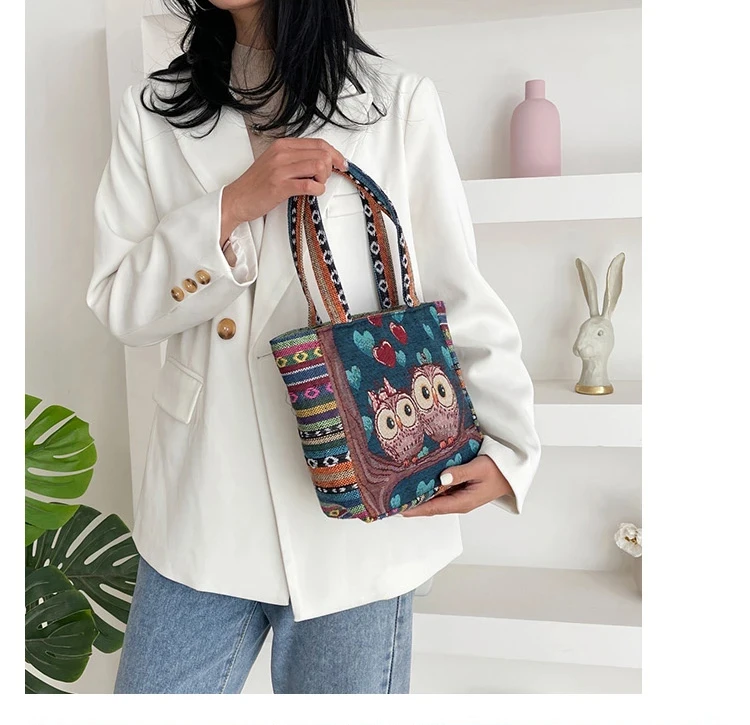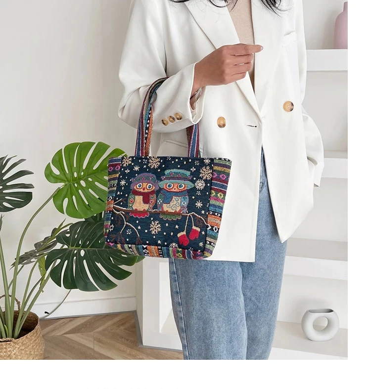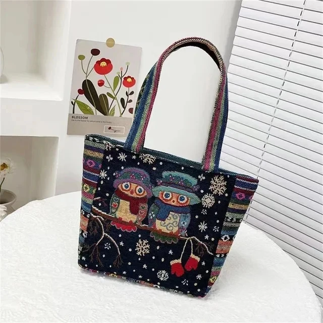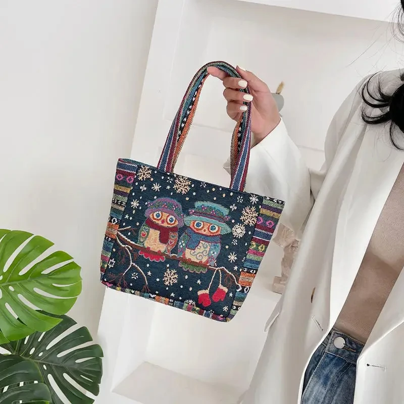 Women Embroidered Tote Bag Retro Owl Elephant Printed Handbags Ladies Large Capacity Reusable Shopping Bag Female Shoulder Bag