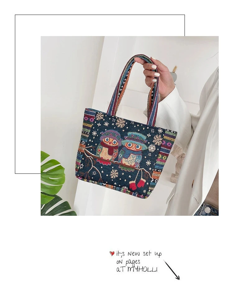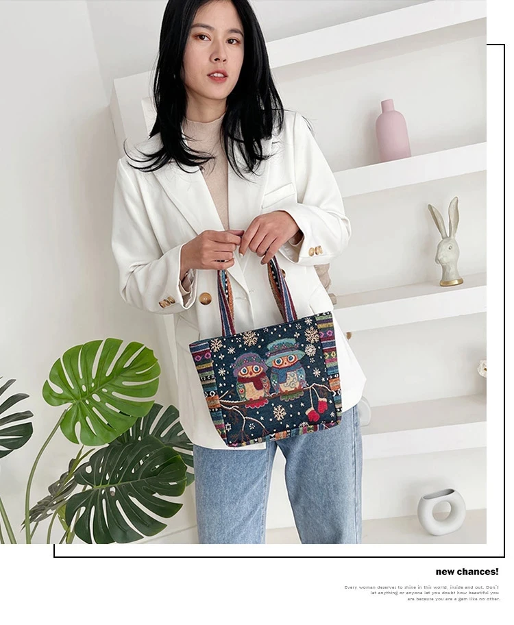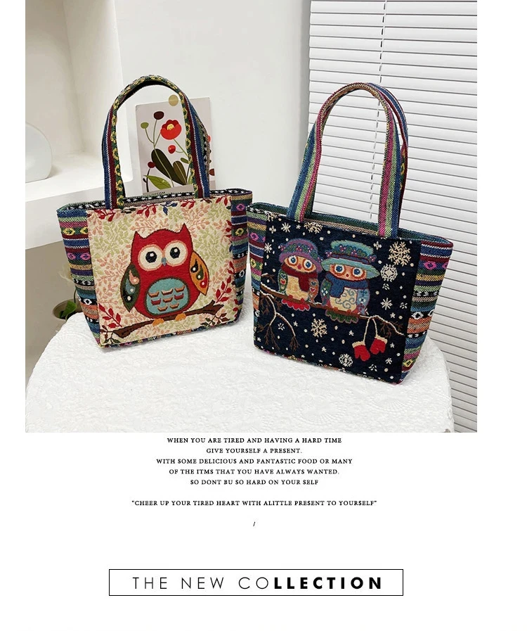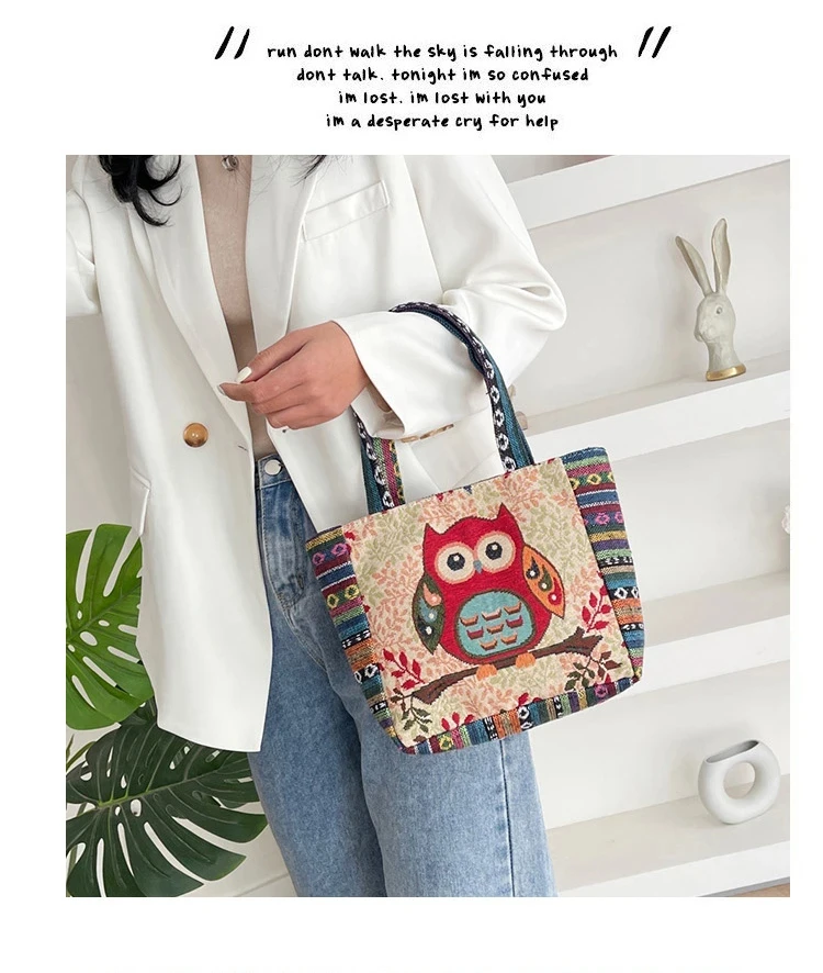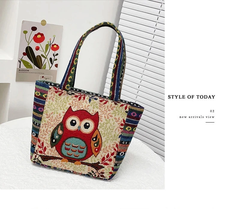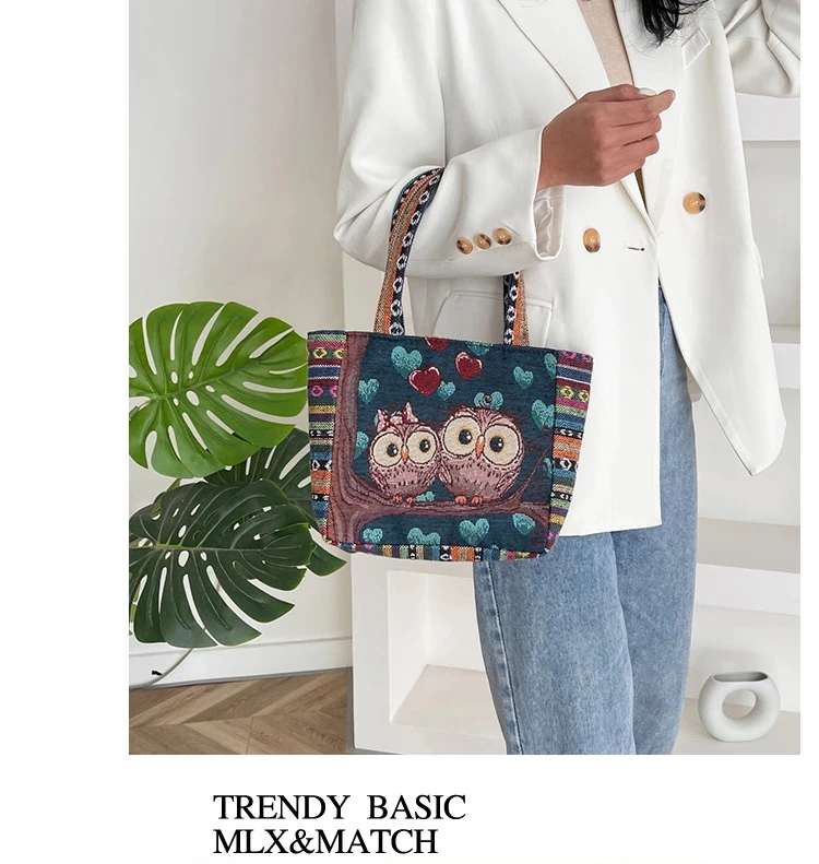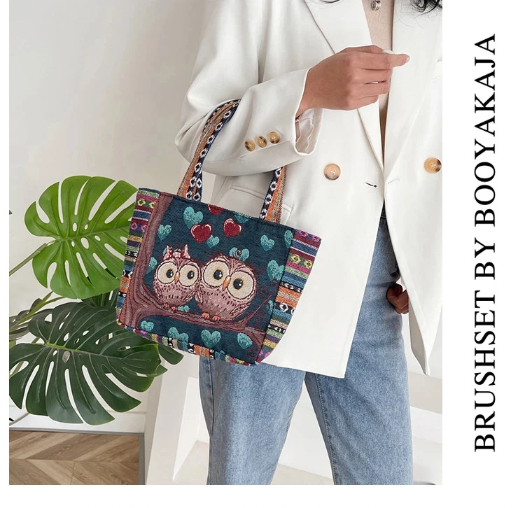 Women Embroidered Tote Bag Retro Owl Elephant Printed Handbags Ladies Large Capacity Reusable Shopping Bag Female Shoulder Bag