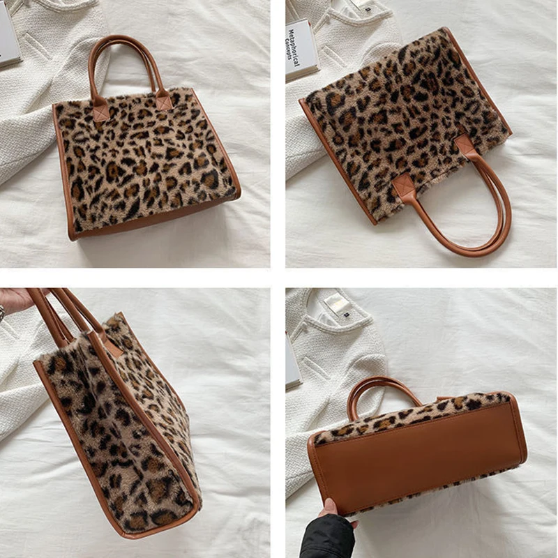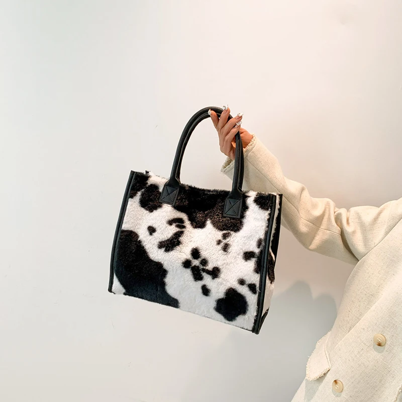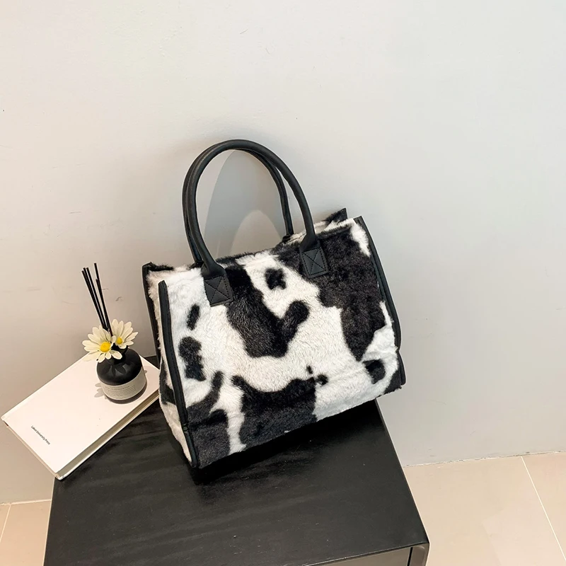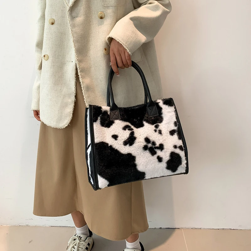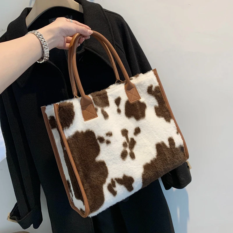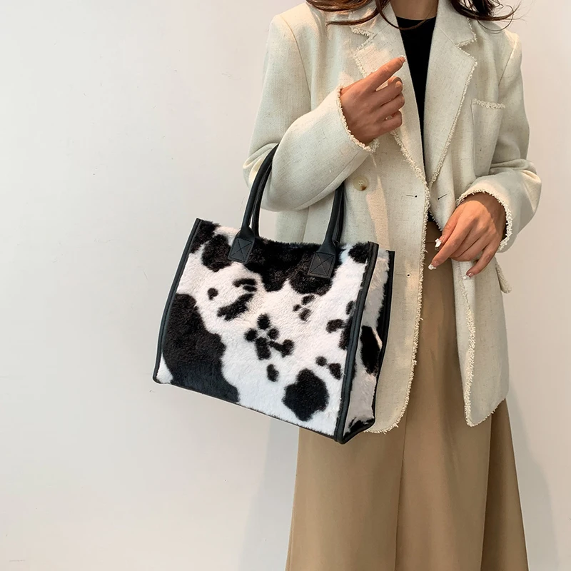 Women's Faux Fur Cow Print Designer Shopper Totes Soft Plush Female Shoulder Bags Winter Large Capacity Handbags and Purse